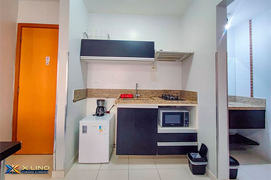 – Cozinha compacta equipada com frigobar, micro-ondas, fogão 2 bocas, depurador, sanduicheira, cafeteira para manter o café sempre quentinho e utensílios básicos (pratos, talheres, copos, panelas e acessórios) para refeições simples.