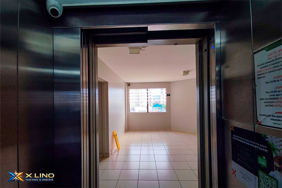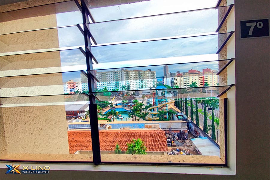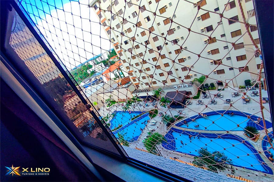 O apartamento Luxo 707 fica no 7º andar, com acesso por elevador e escadas, e tem vista privilegiada para o parque aquático e o nascer do sol. As janelas possuem tela de proteção, trazendo mais segurança, mas é indispensável manter supervisão constante com crianças e pessoas vulneráveis, evitando qualquer esforço sobre a tela.