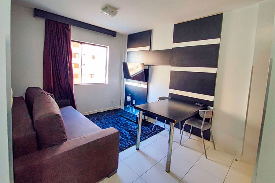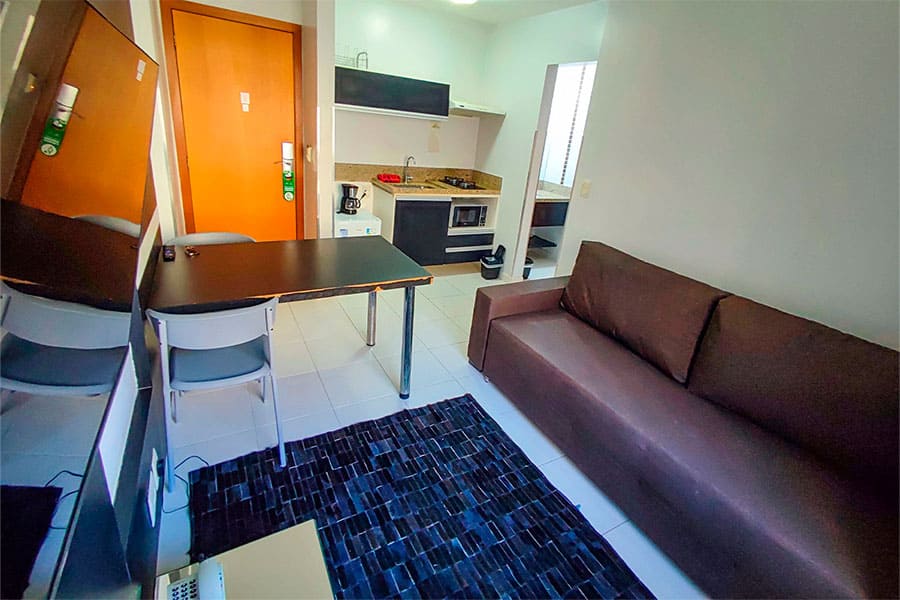 Por ser um apartamento de proprietário, você encontra uma cozinha mais equipada e detalhes de decoração que normalmente não existem em quartos padrão de hotel, além de um atendimento direto e sem burocracia.
