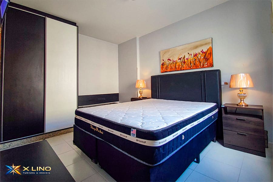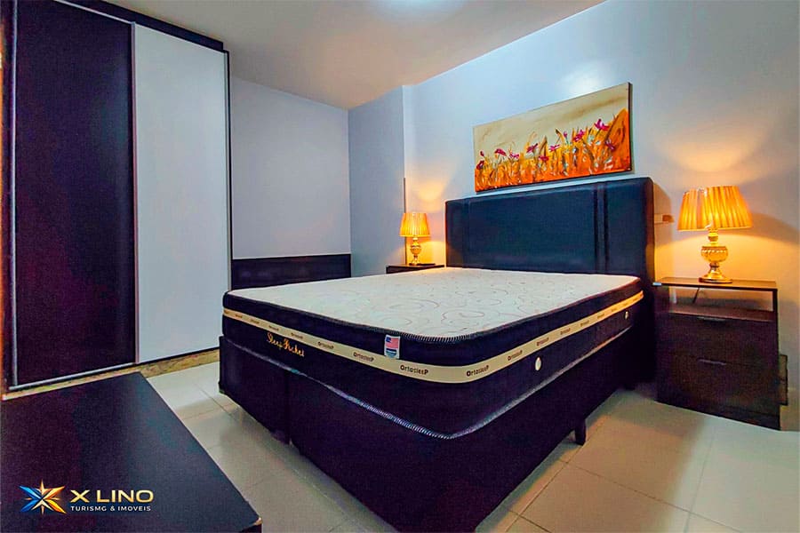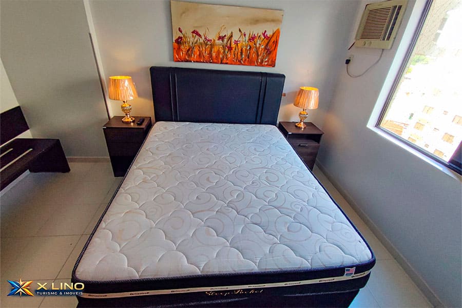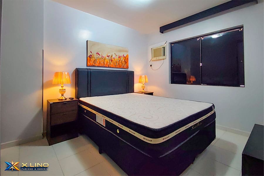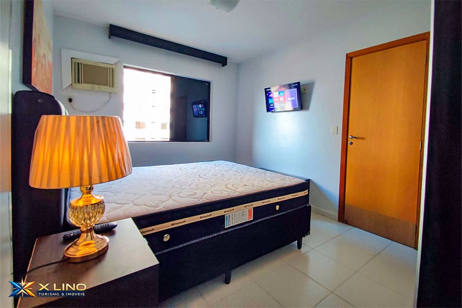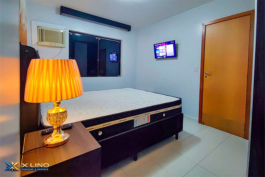 – Quarto com cama queen, ar-condicionado, guarda-roupa, TV e dois abajures dourados, deixando o ambiente moderno e aconchegante.